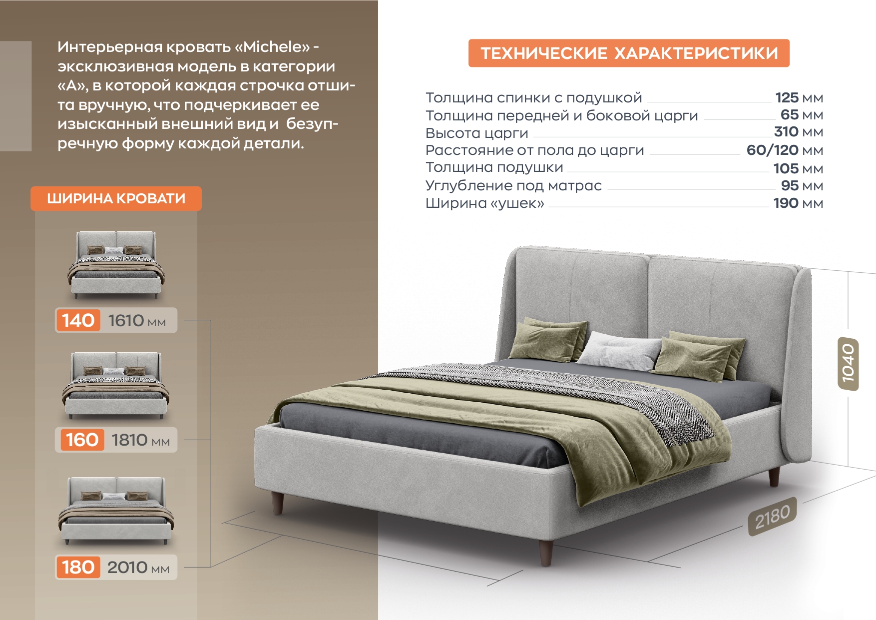 Интерьерная кровать «Michele» - эксклюзивная модель в которой каждая строчка отшита вручную, что подчеркивает ее изысканный внешний вид и безупречную форму каждой детали. Ножки в комплекте: металлические черные